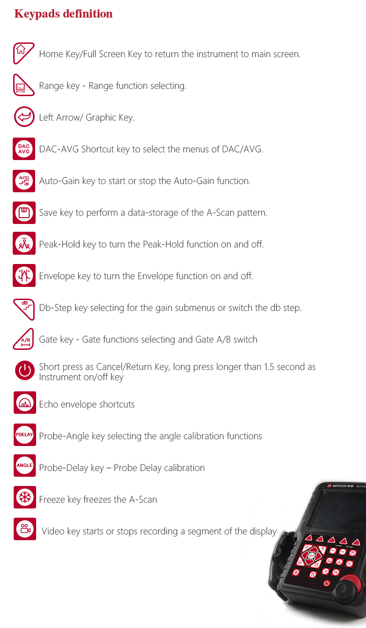 | Memory | be able to store, recall the A-Scan patterns and instrument settings |