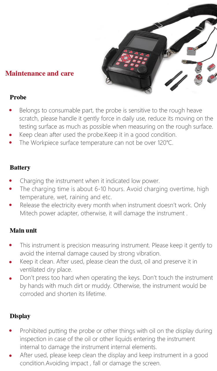 | Mitech B series products of Ultrasonic flaw detector have internal rechargeable Li-ion battery pack rated 7.2V at 8800 mAh,is the standard configuration.When using ,don't disassemble ,and only for supplied charger ,otherwise ,the battery will be damaged .If it’s not used for a long time, be sure to regularly charge and discharge(about once a month), so as to avoid failure. |