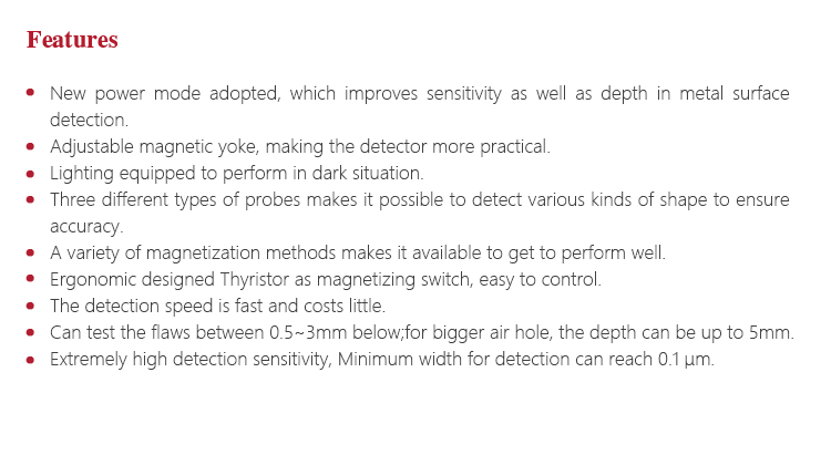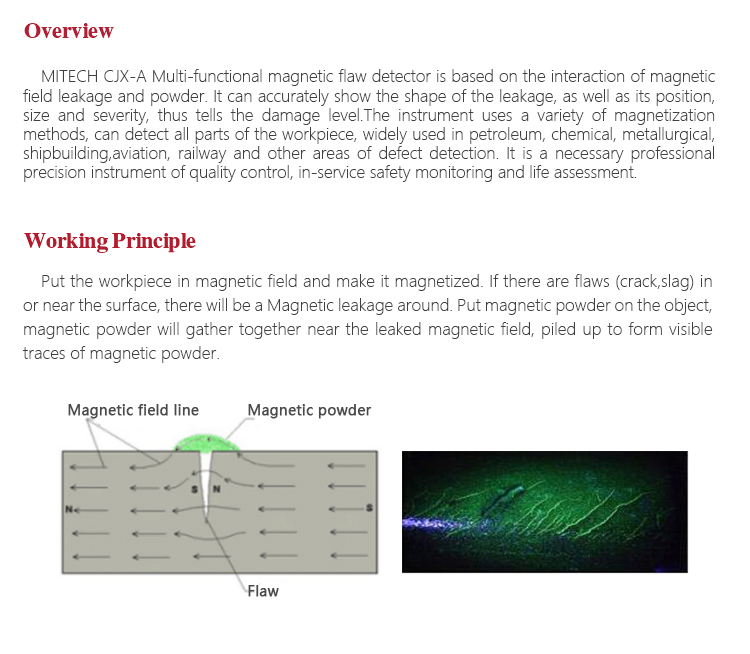 Working PrincipleMagnetize, put the workpiece into high-intensity magnetic field, connect electric to make it magnetized, if there are flaws (crack,slag) in or near the surface, there will be a leakage around the flaws. Put good quality magnetic powder(usually the magnetic iron oxide powder)on the object, magnetic powder will gather together near the leaked magnetic field, piled up to form visible traces of magnetic powder