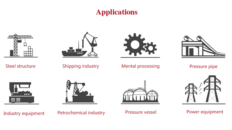 Function & applicationIt is widely used in the industry of aircraft manufacturing, boiler and pressure vessel, electric, oil field, shipbuilding, combustion engine parts, mine, machinery, standard parts, oil pump, vehicle parts, bridging, chemical, railway, large mechanical components, steel structure etc.