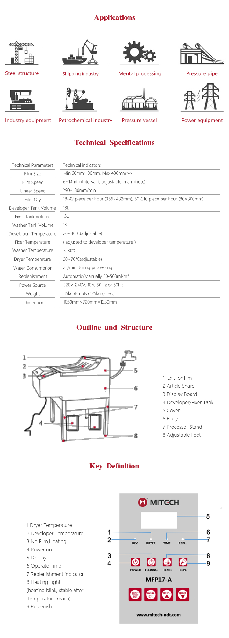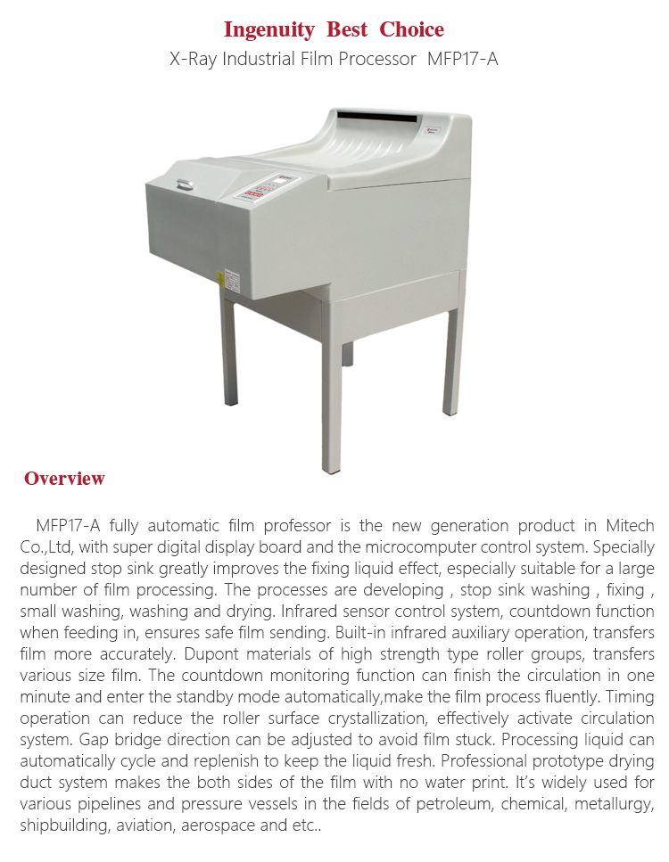 Product OverviewMFP17-A fully automatic film professor is the new generation product in Mitech Co.,Ltd, with super digital display board and the microcomputer control system. Specially designed stop sink greatly improves the fixing liquid effect, especially suitable for a large number of film processing. Processing liquid can automatically cycle and replenish to keep the liquid fresh. Professional prototype drying duct system makes the both sides of the film with no water print. It’s widely used for various pipelines and pressure vessels in the fields of petroleum, chemical, metallurgy, shipbuilding, aviation, aerospace and etc.