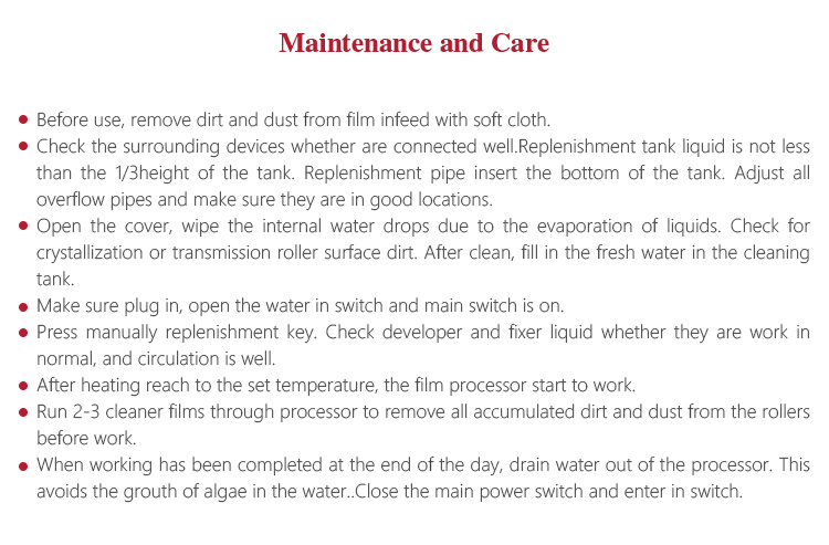 The four processes have high requirements for the temperature, time and liquid concentrations in developer and fixer. Film process has four modes, cold, preheating, wash and self-inspection. Under cold mode, system is on electricity but not work. Under preheating mode, working area starts to heat to certain temperature without film. When the film enters in, temperature goes up rapidly to wash film. Wash mode means film is under washing. Under self-inspection, it can check whether each component is working normally.