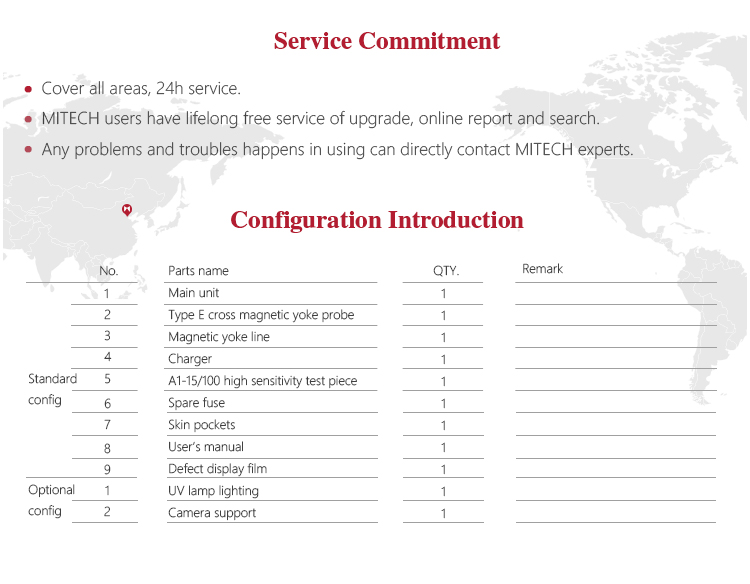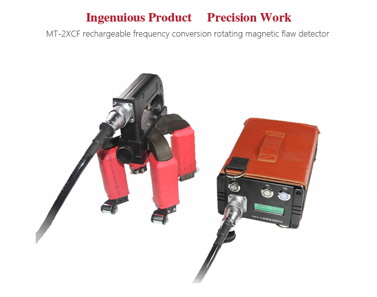 Product OverviewMITECH MT-2XCF rechargeable frequency conversion rotating magnetic flaw detector is based on principle that the leakage magnetic field can absorb the magnetic powder. Make use of magnetic yoke magnetized the workpiece of ferromagnetic material. If there has defects it will produce leakage magnetic field that will adsorb magnetic powder. We could detect the flaw by observing the density of adsorption magnetic powder. It adopts large capacity lithium battery. By the inverter and the phase shifted signal processor to provide power for the detector, it solves the shortcomings of traditional magnetic particle detector relying on the 220V power supply. It has low power consumption and can continuous work for more than 6 hours. And the battery can be charged when the detector is on and off. Especially suitable for the field testing. It can choose the current frequency according to the flaw depth with unique frequency conversion communication design, that improve the detection sensitivity. It’s widely used in aircraft manufacturing, boiler and pressure vessels and other fields. It is a necessary professional precision instrument of quality control, in-service safety monitoring and life assessment.