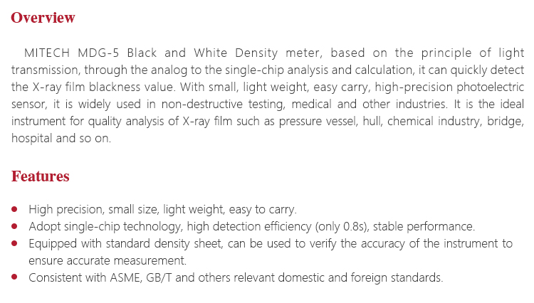 Product OverviewMITECH MDG-5 Black and White Density meter, based on the principle of light transmission, through the analog to the single-chip analysis and calculation, it can quickly detect the X-ray film blackness value. With small, light weight, easy carry, high-precision photoelectric sensor, it is widely used in non-destructive testing, medical and other industries. It is the ideal instrument for quality analysis of X-ray film such as pressure vessel, hull, chemical industry, bridge, hospital and so on.