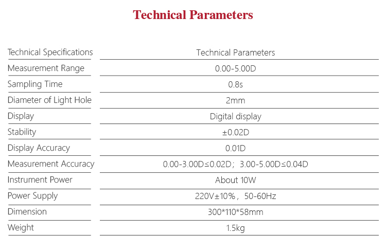 | Measurement Accuracy | 0.00-3.00D≤0.02D;3.00-5.00D≤0.04D |