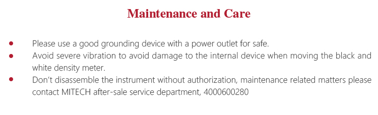 l Avoid severe vibration to avoid damage to the internal device when moving the black and white density meter.