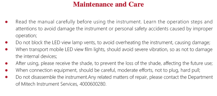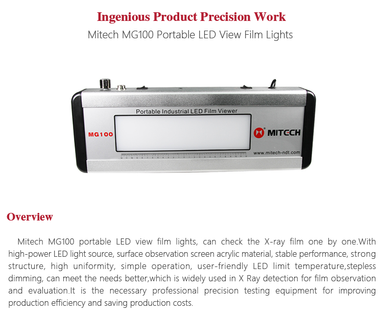 Mitech MG100 portable LED view film lights,can check the X-ray film one by one.With high-power LED light source, surface observation screen acrylic material, stable performance, strong structure, high uniformity, simple operation, user-friendly LED limit temperature, stepless dimming, can meet the needs better,which is widely used in X Ray detection for film observation and evaluation.It is the necessary professional precision testing equipment for improving production efficiency and saving production costs