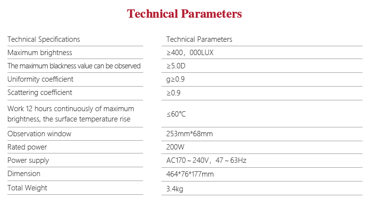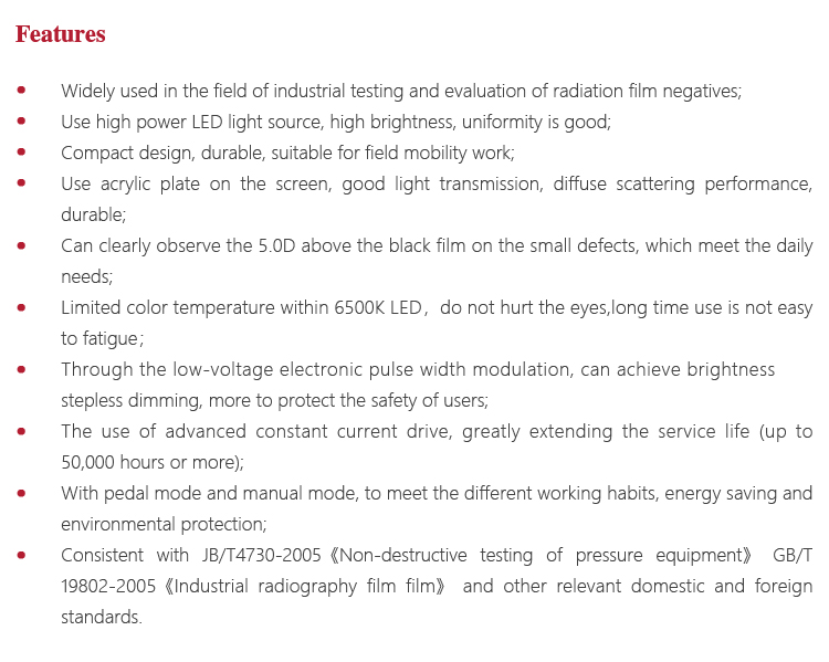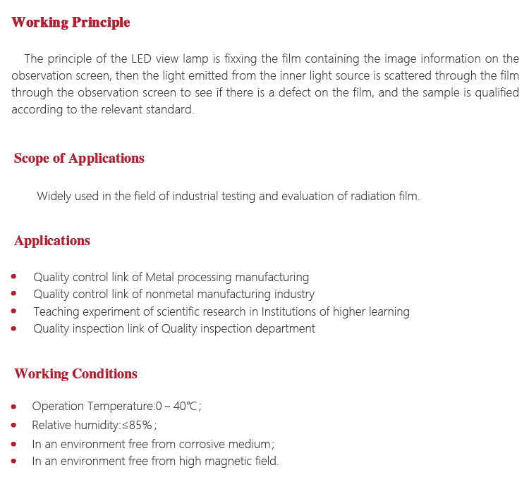 The principle of the LED view lamp is fixxing the film containing the image information on the observation screen, then the light emitted from the inner light source is scattered through the film through the observation screen to see if there is a defect on the film, and the sample is qualified according to the relevant standard