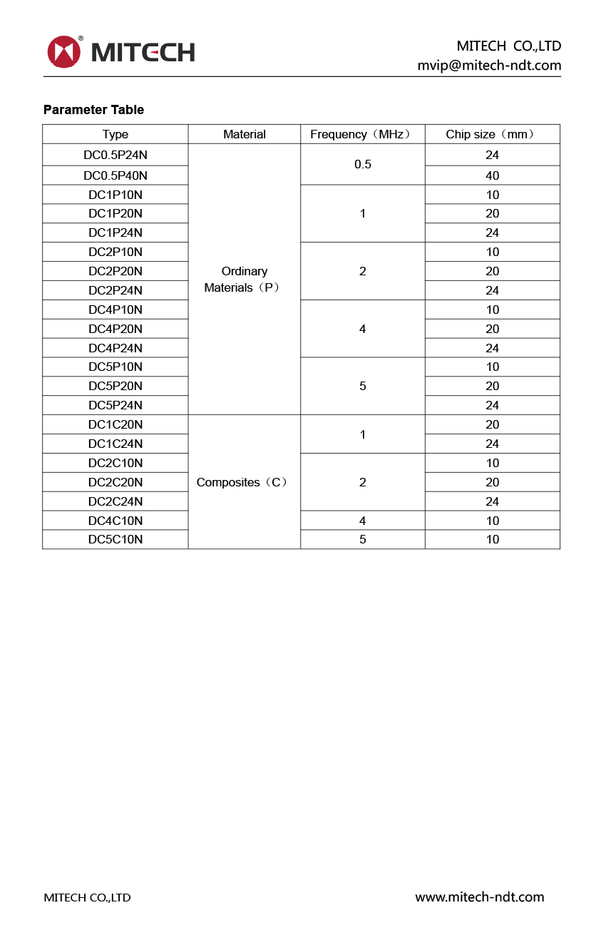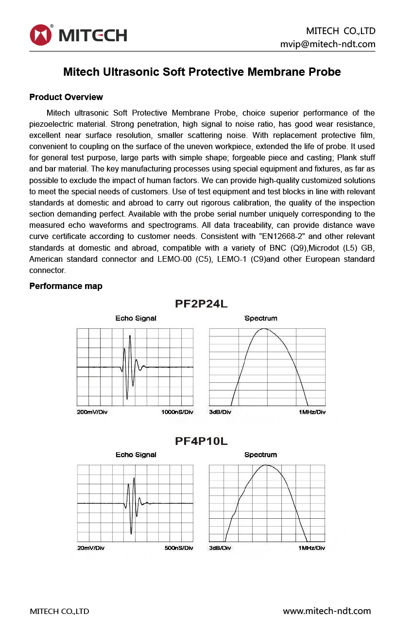 Product OverviewMitech ultrasonic soft protective membrane probe, choice superior performance of the piezoelectric material. Strong penetration, high signal to noise ratio, has good wear resistance, excellent near surface resolution, smaller scattering noise. With replacement protective film, convenient to coupling on the surface of the uneven workpiece, extended the life of probe. It used for general test purpose, large parts with simple shape; forgeable piece and casting; Plank stuff and bar material. The key manufacturing processes using special equipment and fixtures, as far as possible to exclude the impact of human factors. We can provide high-quality customized solutions to meet the special needs of customers. Use of test equipment and test blocks in line with relevant standards at domestic and abroad to carry out rigorous calibration, the quality of the inspection section demanding perfect. Available with the probe serial number uniquely corresponding to the measured echo waveforms and spectrograms. All data traceability, can provide distance wave curve certificate according to customer needs. Consistent with "EN12668-2" and other relevant standards at domestic and abroad, compatible with a variety of BNC (Q9),Microdot (L5) GB, American standard connector and LEMO-00 (C5), LEMO-1 (C9)and other European standard connector.