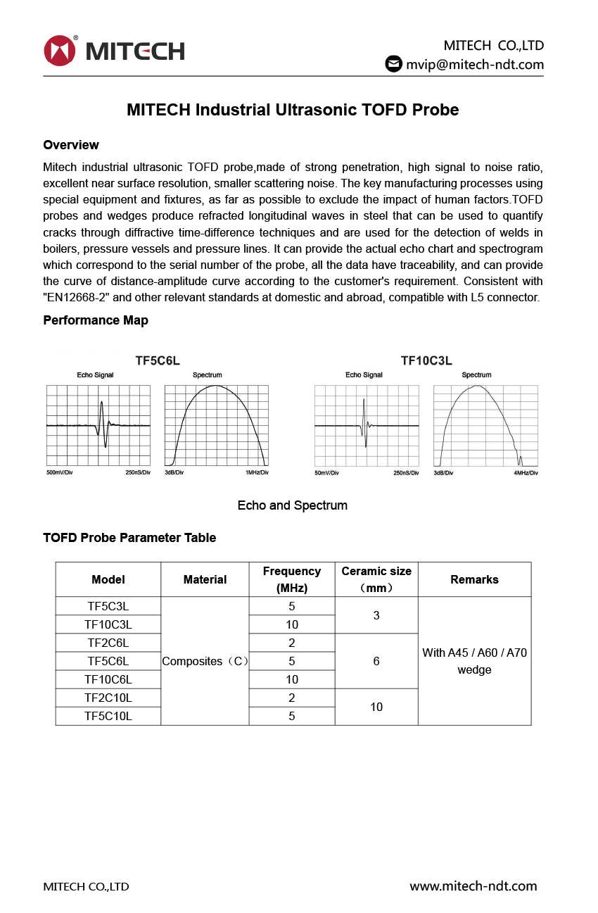 Mitech industrial ultrasonic TOFD probe,made of strong penetration, high signal to noise ratio, excellent near surface resolution, smaller scattering noise. The key manufacturing processes using special equipment and fixtures, as far as possible to exclude the impact of human factors.TOFD probes and wedges produce refracted longitudinal waves in steel that can be used to quantify cracks through diffractive time-difference techniques and are used for the detection of welds in boilers, pressure vessels and pressure lines. It can provide the actual echo chart and spectrogram which correspond to the serial number of the probe, all the data have traceability, and can provide the curve of distance-amplitude curve according to the customer's requirement. Consistent with "EN12668-2" and other relevant standards at domestic and abroad, compatible with L5 connector.