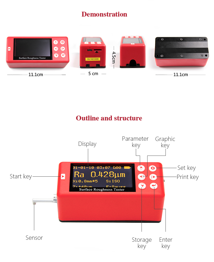 When measuring roughness of part surface, the probe is placed on the surface of the part and then tracing the surface at constant rate. The probe acquires the surface roughness by the sharp stylus in probe. The roughness causes displacement of probe which results in change of inductive value of induction coils thus generate analogue signal which is in proportion to surface roughness at output end of phase-sensitive rectifier. This signal enters data collection system after amplification and level conversion. After that, those collected data are processed with digital filtering and parameter calculation by ARM chip and the measuring result can be read on OLED display. The results can be printed by Bluetooth printer.
