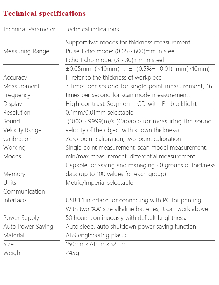 Instrument MaintenanceWhen the thickness gauge appears some other abnormal phenomena, please do not dismantle or adjust any fixedly assembled parts. Fill in and present the warranty card to us. The warranty service can be carried on. Keep it away from vibration, strong magnetic field, corrosive medium, dumpiness and dust. Storage in ordinary temperature. With Original packing, transport is allowed on the third grade highway.