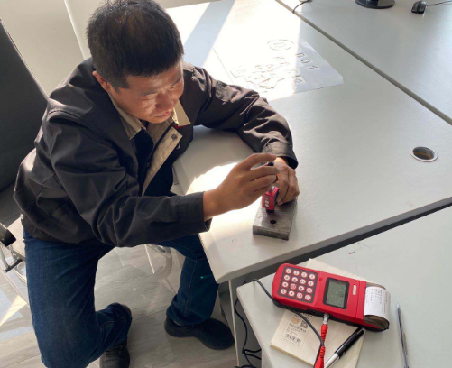 隨后美泰工程師隨李工來到工廠對現場工件做硬度及缺陷檢測,在現場美泰工程師使用里氏硬度計MH500對現場工件進行了硬度測試,最終顯示數值也十分穩定,并且MH500里氏硬度計支持現場打印測量結果更便于數據留存記錄。