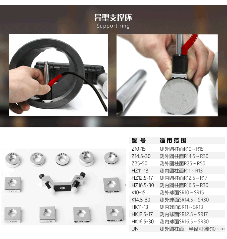 當被測表面曲率半徑R小于30mm的工件在測試時應使用小支承環或異型支承環。