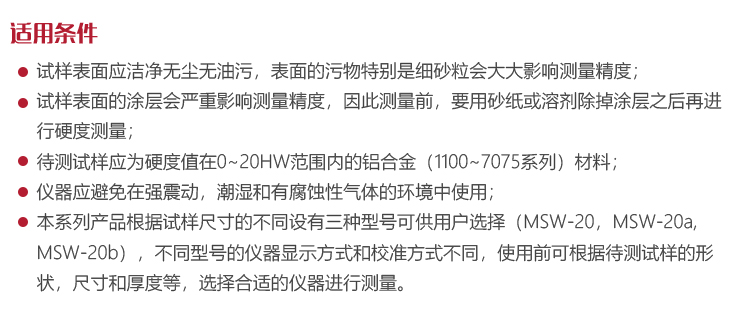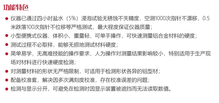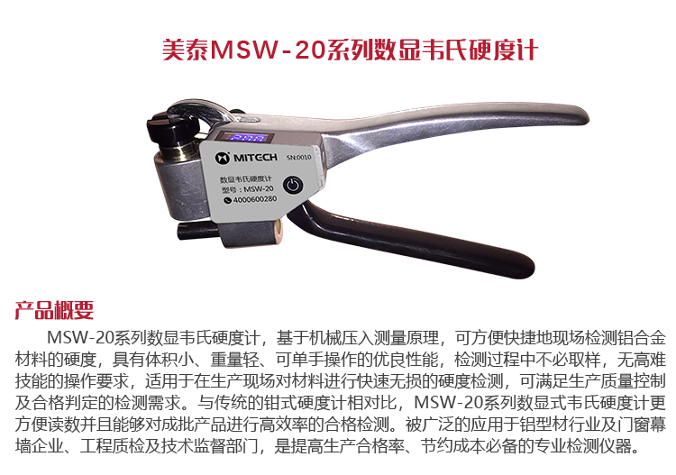 產品概述MSW-20系列數顯韋氏硬度計,分為MSW-20、MSW-20a、MSW-20b三種型號,它們體積小、重量輕、可單手操作,檢測過程中不必取樣,無高難技能的操作要求,適用于在生產現場對材料進行快速無損的硬度檢測。與傳統鉗式硬度計相對比,數字顯示更方便讀數??蓾M足生產質量控制及合格判定的檢測需求,對成批產品進行逐件檢測。被廣泛的應用于鋁型材行業及諸多門窗幕墻企業、工程質檢及技術監督部門,是提高生產合格率、節約成本必備的專業儀器。