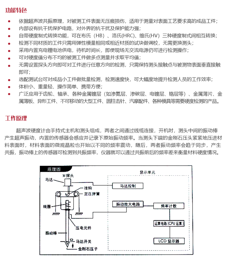 工作原理超聲波硬度計由手持式主機和測頭組成,兩者之間通過線纜連接,測頭中間內置一根振動棒,下端連接維氏壓頭。開機后,振動棒產生超聲振動,振動頻率被固定在振動棒上的傳感器感應到,當測頭下端的金剛石壓頭緊緊地壓進材料表面時,微觀上,振動棒把震蕩傳遞給材料的微觀晶粒,使得晶粒也開始以不同的頻率震動,當兩者振動頻率趨于同步時會產生共振,于是,傳感器可檢測到振動棒共振前后的頻率變化量,根據材料的彈性模量和頻率變化量可推算出材料硬度值。