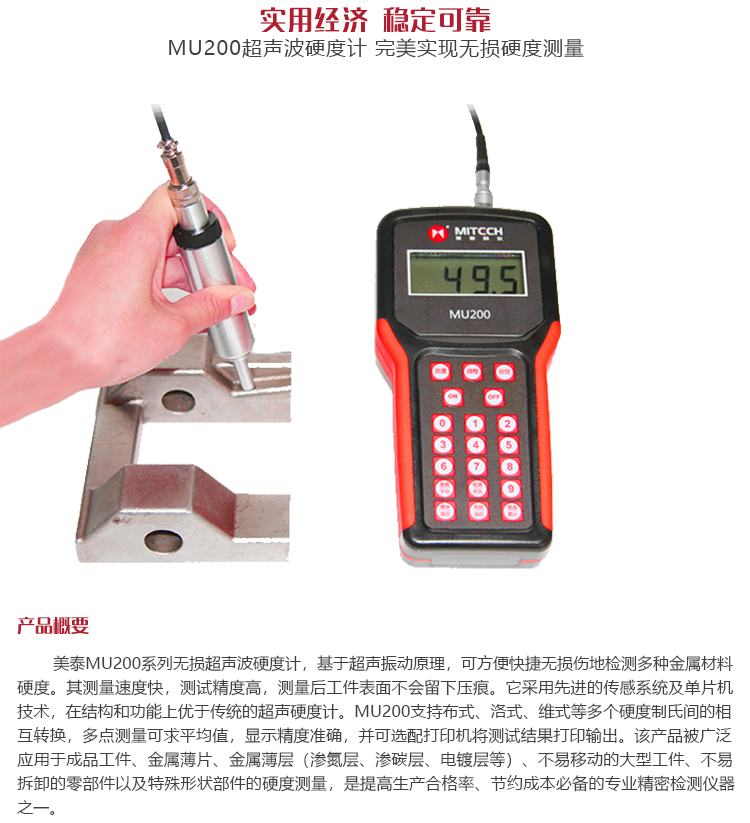美泰MU200系列無損超聲波硬度計,基于傳感器測桿的超聲振動原理,可方便快捷無損傷地檢測多種金屬材料硬度。其測量速度快,測試精度高,測量后工件表面不會留下壓痕。它采用先進的傳感系統及單片機技術,在結構和功能上優于傳統的超聲硬度計。MU200支持布式、洛式、維式等多個硬度制氏間的相互轉換,多點測量可求平均值,顯示精度準確,并可選配打印機將測試結果打印輸出。該產品被廣泛應用于成品工件、金屬薄片、金屬薄層(滲氮層、滲碳層、電鍍層等)、不易移動的大型工件、不易拆卸的零部件以及特殊形狀部件的硬度測量,是提高生產合格率、節約成本必備的專業精密檢測儀器之一。