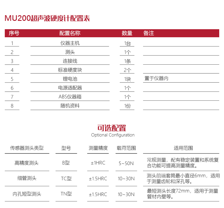 | 美泰MU200超聲波硬度計B型高精度測頭,內置更加精密的傳感器,測量示值精度可達±1HRC,壓頭接觸工件表面時的載荷范圍為5-50N。可測量大多數非異形工件。配有穩定裝置和系統復功能使儀器精度達到最佳測試狀態,堅固耐用,易于更換,使用方便。 | |