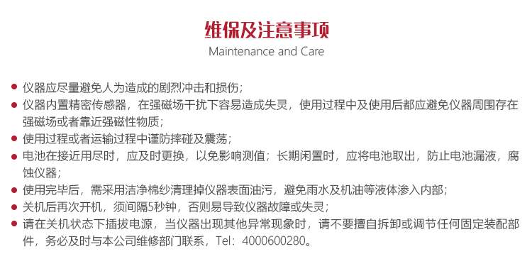 儀器內置精密傳感器,在強磁場干擾下會失去測量精度,使用過程中及使用后都應避免周圍存在強磁場或者靠近強磁性物質