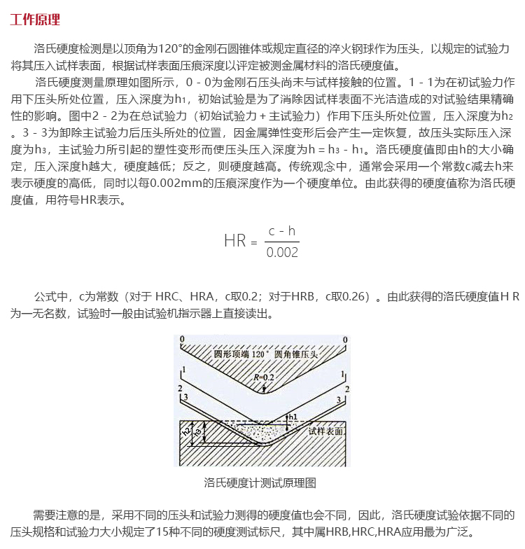 工作原理洛氏硬度檢測是以頂角為120°的金剛石圓錐體或規定直徑的淬火鋼球作為壓頭,以規定的試驗力將其壓入試樣表面,根據試樣表面壓痕深度以評定被測金屬材料的洛氏硬度值。