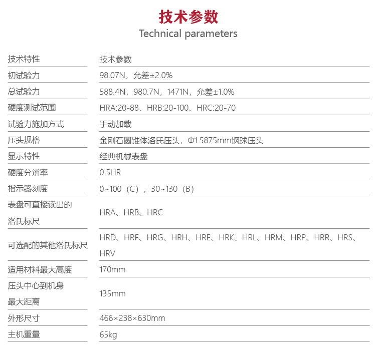 | 壓頭規格 | 金剛石圓錐體洛氏壓頭,Φ1.5875mm硬質合金鋼球壓頭 |