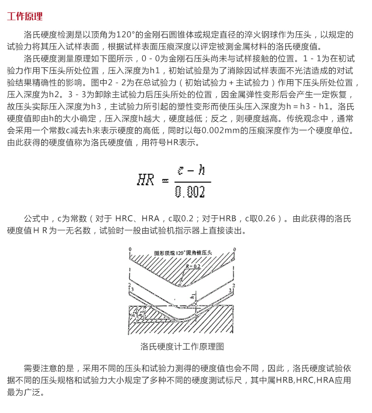 公式中,c為常數(對于 HRC、HRA,c取0.2;對于HRB,c取0.26)。由此獲得的洛氏硬度值HR為一無名數,試驗時一般由試驗機指示器上直接讀出。