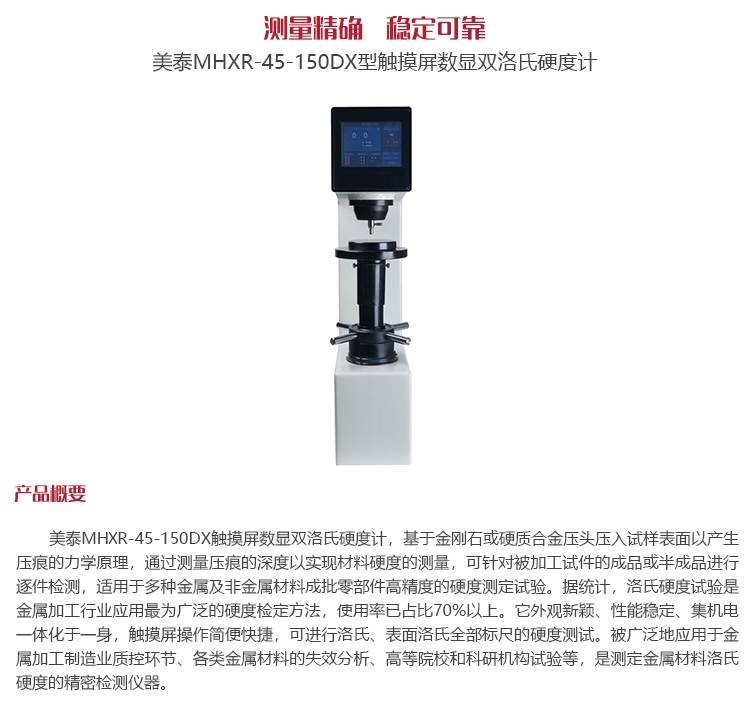 美泰MHXR-45-150DX觸摸屏數(shù)顯雙洛氏硬度計,基于金剛石或硬質(zhì)合金壓頭壓入試樣表面以產(chǎn)生壓痕的力學(xué)原理,通過測量壓痕的深度以實現(xiàn)材料硬度的測量,可針對被加工試件的成品或半成品進(jìn)行逐件檢測,適用于多種金屬及非金屬材料成批零部件高精度的硬度測定試驗。據(jù)統(tǒng)計,洛氏硬度試驗是金屬加工行業(yè)應(yīng)用最為廣泛的硬度檢定方法,使用率已占比70%以上。它外觀新穎、性能穩(wěn)定、集機(jī)電一體化于一身,觸摸屏操作簡便快捷,可進(jìn)行洛氏、表面洛氏全部標(biāo)尺的硬度測試。被廣泛地應(yīng)用于金屬加工制造業(yè)質(zhì)控環(huán)節(jié)、各類金屬材料的失效分析、高等院校和科研機(jī)構(gòu)試驗等,是測定金屬材料洛氏硬度的精密檢測儀器。