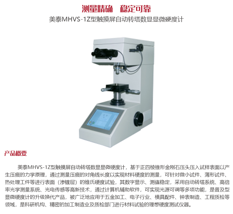 美泰MHVS-1Z型觸摸屏自動轉(zhuǎn)塔數(shù)顯顯微硬度計,基于正四棱錐形金剛石壓頭壓入試樣表面以產(chǎn)生壓痕的力學(xué)原理,通過測量壓痕的對角線長度以實現(xiàn)材料硬度的測量,可針對微小試件、薄形試件、熱處理工件等進行表面(滲鍍層)的維氏硬度試驗,其數(shù)字顯示、測值穩(wěn)定,采用自動轉(zhuǎn)塔系統(tǒng)、高倍率光學(xué)測量系統(tǒng)、光電傳感等高新技術(shù),通過計算機輔助軟件,可實現(xiàn)光源可調(diào)等多項功能,是普及型顯微硬度計的升級換代產(chǎn)品,被廣泛地應(yīng)用于五金加工、電子行業(yè)、模具配件、鐘表制造、工程質(zhì)檢等領(lǐng)域,是科研機構(gòu)、精密的加工制造業(yè)及質(zhì)檢部門進行材料試驗的理想硬度測試儀器。