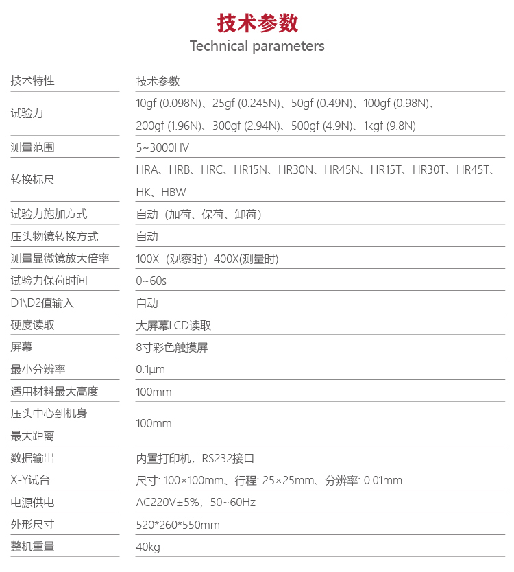 | 試驗力 | 10gf (0.098N)、25gf (0.245N)、50gf (0.49N)、100gf (0.98N)、 200gf (1.96N)、300gf (2.94N)、500gf (4.9N)、1kg |