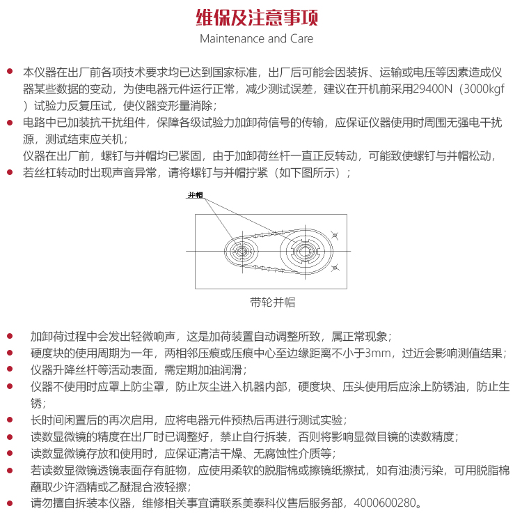 儀器的保養與維護美泰MHBS-3000Z觸摸屏自動轉塔數顯布氏硬度計屬精密檢測儀器,使用中應特別注意如下事項: