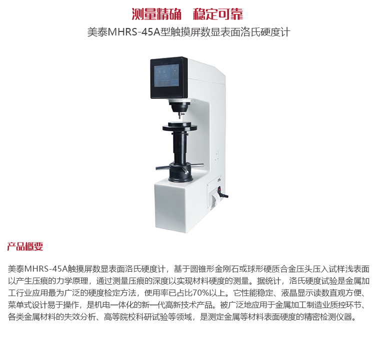 美泰MHRS-45A觸摸屏數顯表面洛氏硬度計,基于圓錐形金剛石或球形硬質合金壓頭壓入試樣淺表面以產生壓痕的力學原理,通過測量壓痕的深度以實現材料硬度的測量。據統計,洛氏硬度試驗是金屬加工行業應用最為廣泛的硬度檢定方法,使用率已占比70%以上。它性能穩定、液晶顯示讀數直觀方便、菜單式設計易于操作,是機電一體化的新一代高新技術產品。被廣泛地應用于金屬加工制造業質控環節、各類金屬材料的失效分析、高等院校科研試驗等領域,是測定金屬等材料表面硬度的精密檢測儀器。