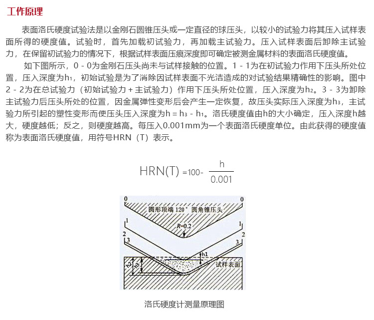 表面洛氏硬度試驗法是以金剛石圓錐壓頭或一定直徑的球壓頭,以較小的試驗力將其壓入試樣表面所得的硬度值。試驗時,首先加載初試驗力,再加載主試驗力。壓入試樣表面后卸除主試驗力,在保留初試驗力的情況下,根據試樣表面壓痕深度即可確定被測金屬材料的表面洛氏硬度值。