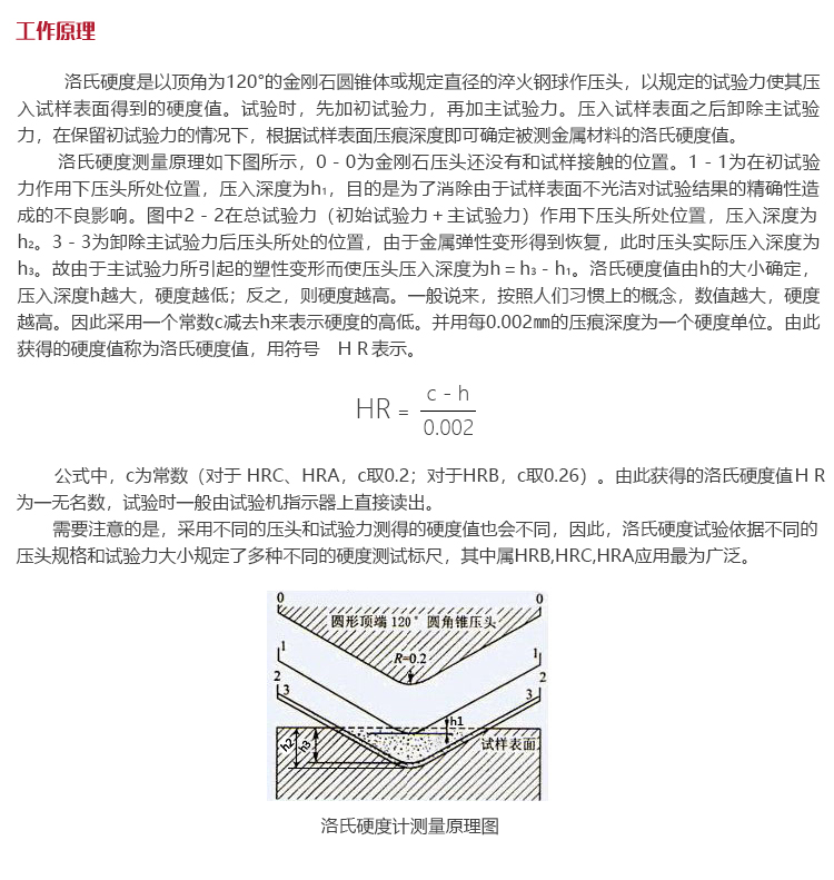 公式中,c為常數(對于 HRC、HRA,c取0.2;對于HRB,c取0.26)。由此獲得的洛氏硬度值HR為一無名數,試驗時一般由試驗機指示器上直接讀出。