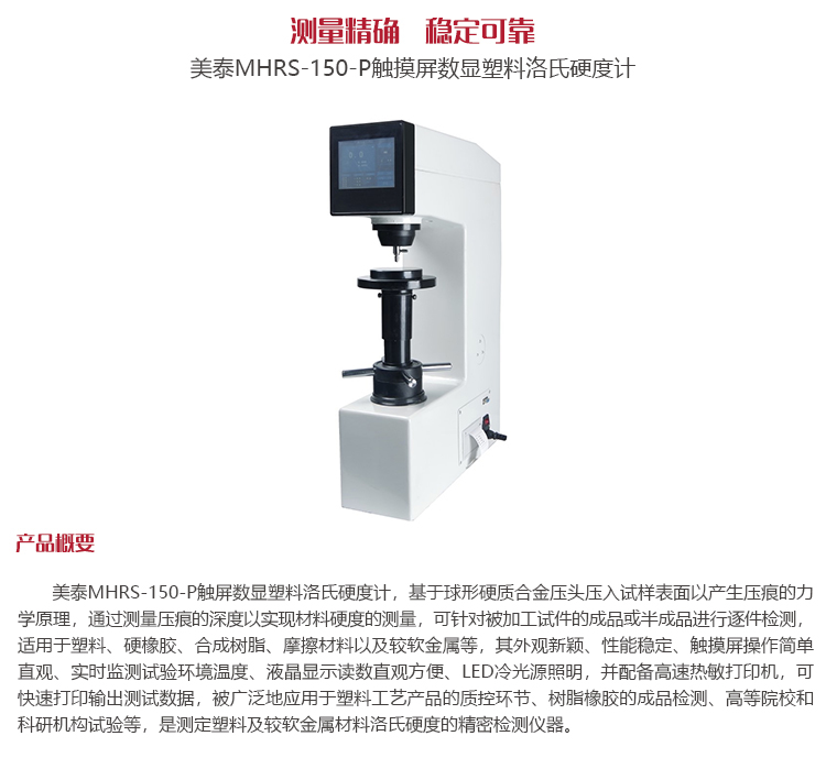 產品概述美泰MHRS-150-P觸屏數顯塑料洛氏硬度計,基于球形硬質合金壓頭壓入試樣表面以產生壓痕的力學原理,通過測量壓痕的深度以實現材料硬度的測量,可針對被加工試件的成品或半成品進行逐件檢測,適用于塑料、硬橡膠、合成樹脂、摩擦材料以及較軟金屬等,其外觀新穎、性能穩定、觸摸屏操作簡單直觀、實時監測試驗環境溫度、液晶顯示讀數直觀方便、LED冷光源照明,并配備高速熱敏打印機,可快速打印輸出測試數據,被廣泛地應用于塑料工藝產品的質控環節、樹脂橡膠的成品檢測、高等院校和科研機構試驗等,是測定塑料及較軟金屬材料洛氏硬度的精密檢測儀器。