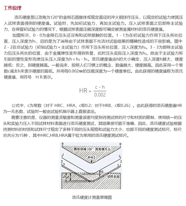 洛氏硬度是以頂角為120°的金剛石圓錐體或規(guī)定直徑的淬火鋼球作壓頭,以規(guī)定的試驗(yàn)力使其壓入試樣表面得到的硬度值。試驗(yàn)時(shí),先加初試驗(yàn)力,再加主試驗(yàn)力。壓入試樣表面之后卸除主試驗(yàn)力,在保留初試驗(yàn)力的情況下,根據(jù)試樣表面壓痕深度即可確定被測(cè)金屬材料的洛氏硬度值。