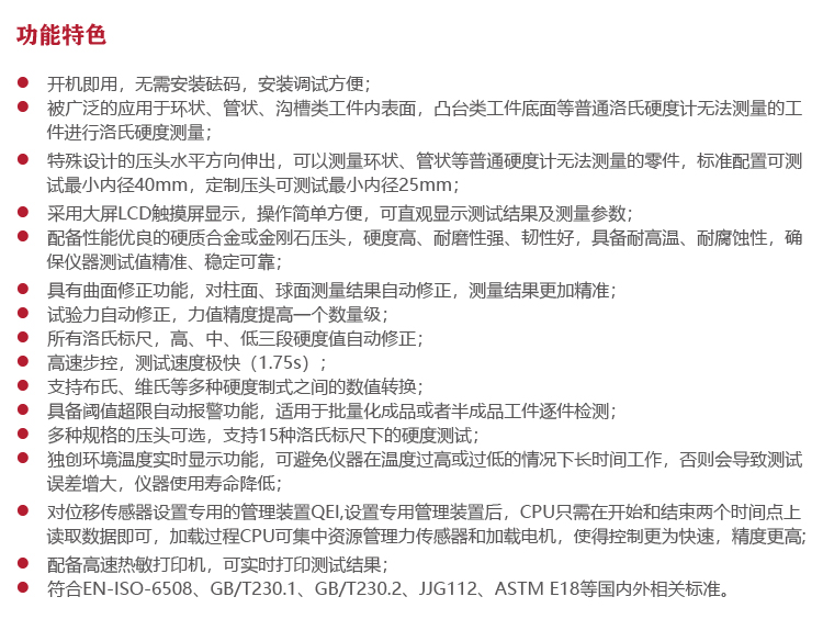 ?符合EN-ISO-6508、GB/T230.1、GB/T230.2、JJG112、ASTM E18等國(guó)內(nèi)外相關(guān)標(biāo)準(zhǔn)。
