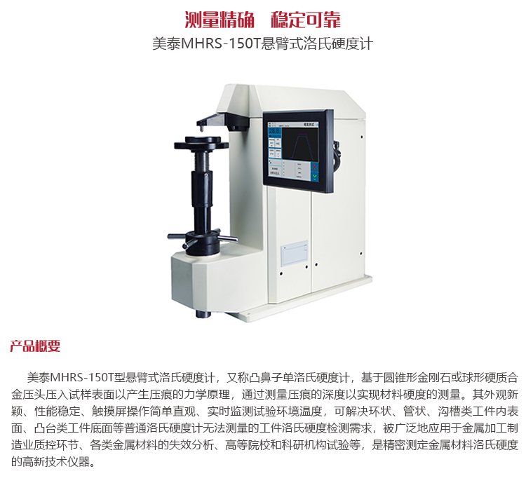 產(chǎn)品概述美泰MHRS-150T型懸臂式洛氏硬度計(jì),又稱凸鼻子單洛氏硬度計(jì),基于圓錐形金剛石或球形硬質(zhì)合金壓頭壓入試樣表面以產(chǎn)生壓痕的力學(xué)原理,通過(guò)測(cè)量壓痕的深度以實(shí)現(xiàn)材料硬度的測(cè)量。其外觀新穎、性能穩(wěn)定、觸摸屏操作簡(jiǎn)單直觀、實(shí)時(shí)監(jiān)測(cè)試驗(yàn)環(huán)境溫度,可解決環(huán)狀、管狀、溝槽類(lèi)工件內(nèi)表面、凸臺(tái)類(lèi)工件底面等普通洛氏硬度計(jì)無(wú)法測(cè)量的工件洛氏硬度檢測(cè)需求,被廣泛地應(yīng)用于金屬加工制造業(yè)質(zhì)控環(huán)節(jié)、各類(lèi)金屬材料的失效分析、高等院校和科研機(jī)構(gòu)試驗(yàn)等,是精密測(cè)定金屬材料洛氏硬度的高新技術(shù)儀器。