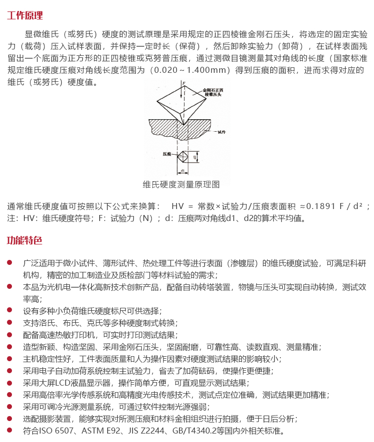 ?廣泛適用于微小試件、薄形試件、熱處理工件等進行表面(滲鍍層)的維氏硬度試驗,可滿足科研機構,精密的加工制造業及質檢部門等材料試驗的需求;