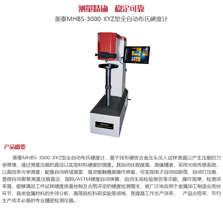 產品概述美泰MHBS-3000-XYZ型全自動布氏硬度計,基于球形硬質合金壓頭壓入試樣表面以產生壓痕的力學原理,通過測量壓痕的直徑以實現材料硬度的測量。其自動化程度高、測值精準,采用光電傳感系統,以高倍率光學測量,配備自動轉塔裝置、高靈敏觸摸屏操作界面,可實現電子自動加卸荷、自動打壓痕、顯微自動聚焦測量壓痕直徑、國標/ASTM硬度自動換算、自動生成檢驗報告等功能,操作簡便,檢測效率高,能夠滿足工件試樣硬度質量控制及合格評定的硬度檢測需求,被廣泛地應用于金屬加工制造業質控環節、各類金屬材料的失效分析、高等院??蒲袑嶒灥阮I域,是提高工作生產效率,產品合格率,節約生產成本必備的專業精密檢測儀器。