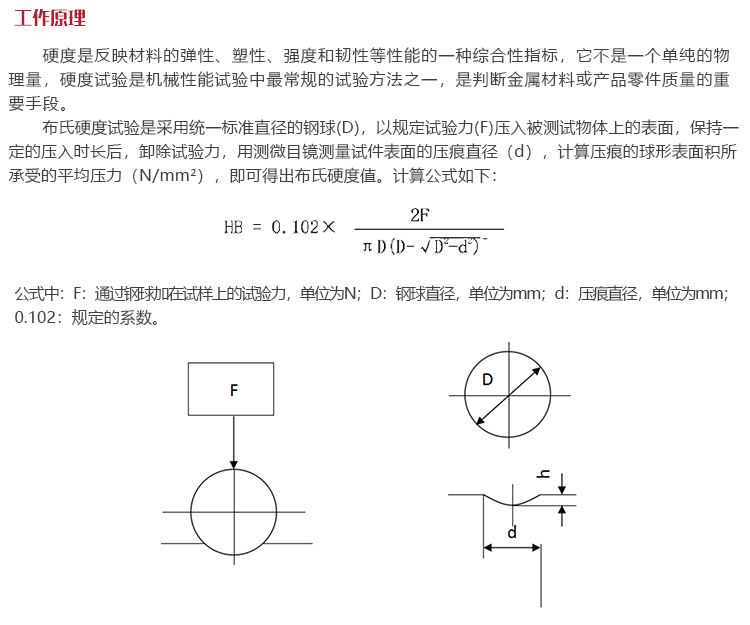 工作原理布氏硬度試驗是采用統一標準直徑的鋼球(D)壓頭,以規定試驗力(F)壓入被測試件表面,保持一定的壓入時長后,卸除試驗力,用測微目鏡測量試件表面的壓痕直徑(d),以計算壓痕的球形表面積所承受的平均壓力(N/mm2),即可得出布氏硬度值。計算公式如下: