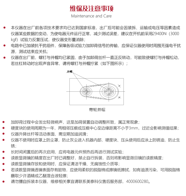 儀器的保養與維護本儀器在出廠前各項技術要求均已達到國家標準,出廠后可能會因裝拆、運輸或電壓等因素造成儀器某些數據的變動,為使電器元件運行正常,減少測試誤差,建議在開機前采用29400N(3000kgf)試驗力反復壓試,使儀器變形量消除;