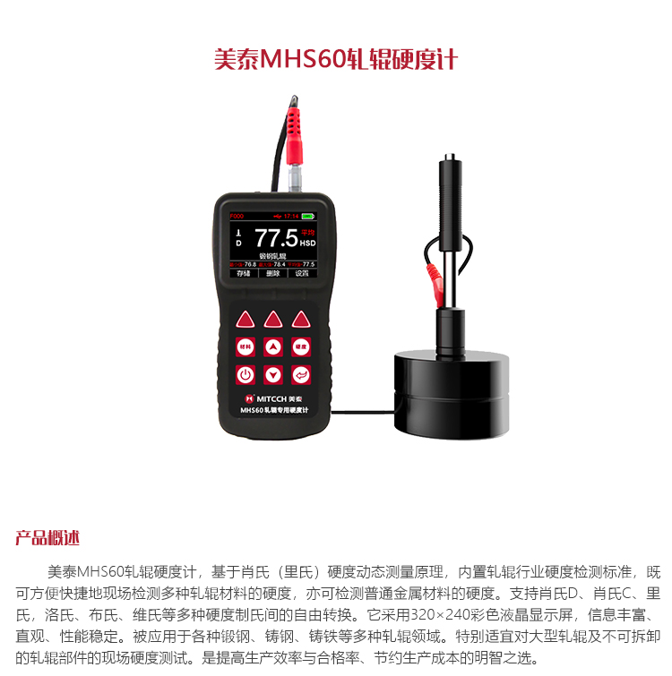 產品概述美泰MHS60軋輥硬度計,基于肖氏(里氏)硬度動態測量原理,內置軋輥行業硬度檢測標準,既可方便快捷地現場檢測多種軋輥材料的硬度,亦可檢測普通金屬材料的硬度。支持肖氏D、肖氏C、里氏,洛氏、布氏、維氏等多種硬度制氏間的自由轉換。它采用320×240彩色液晶顯示屏,信息豐富、直觀、性能穩定。被應用于各種鍛鋼、鑄鋼、鑄鐵等多種軋輥領域。特別適宜對大型軋輥及不可拆卸的軋輥部件的現場硬度測試。是提高生產效率與合格率、節約生產成本的明智之選。
