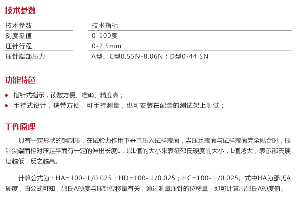 | 壓針端部壓力 | A型、C型0.55N-8.06N;D型0-44.5N |