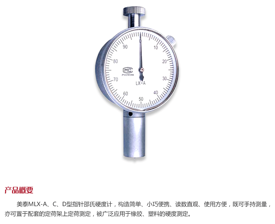 美泰MLX-A、C、D型指針邵氏硬度計(jì),構(gòu)造簡(jiǎn)單、小巧便攜、讀數(shù)直觀、使用方便,既可手持測(cè)量,亦可置于配套的定荷架上定荷測(cè)定,被廣泛應(yīng)用于橡膠、塑料的硬度測(cè)定。