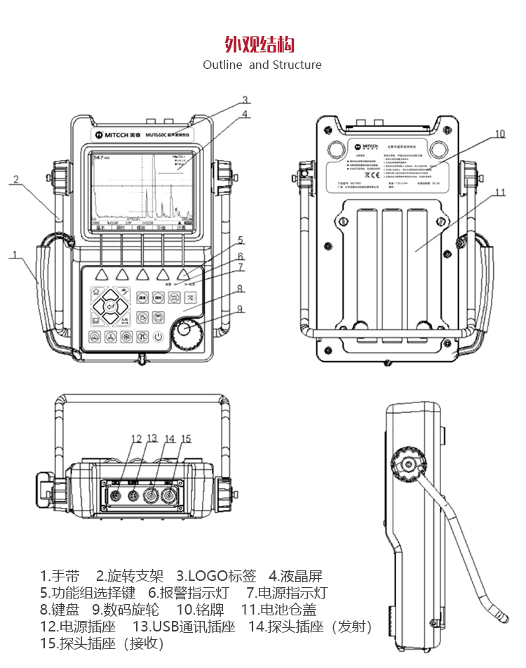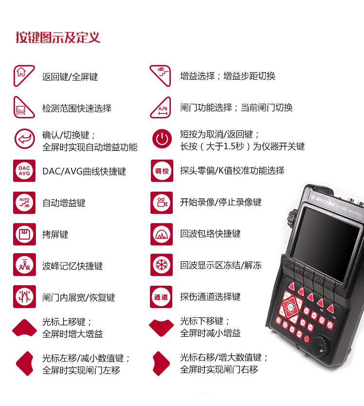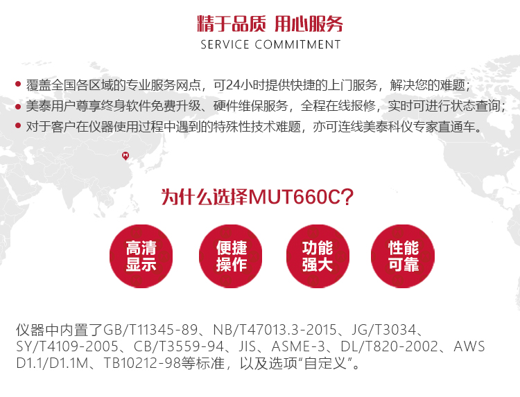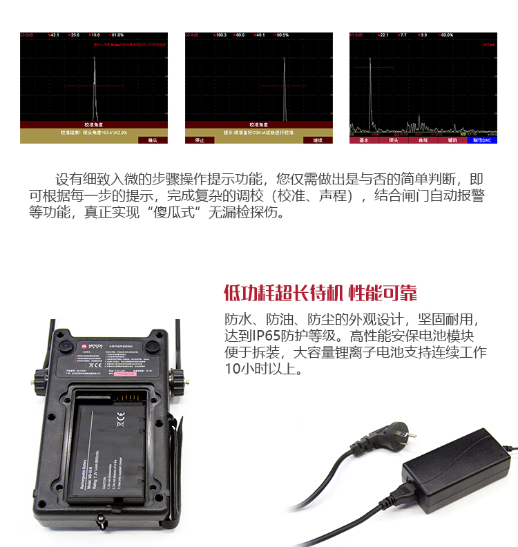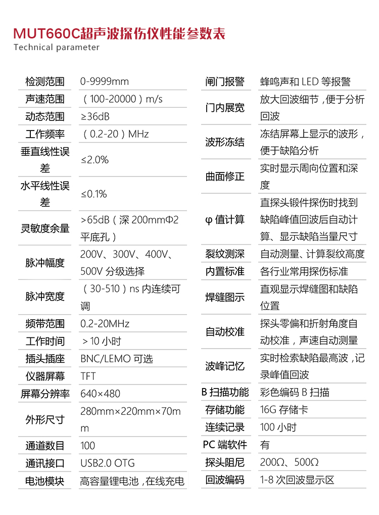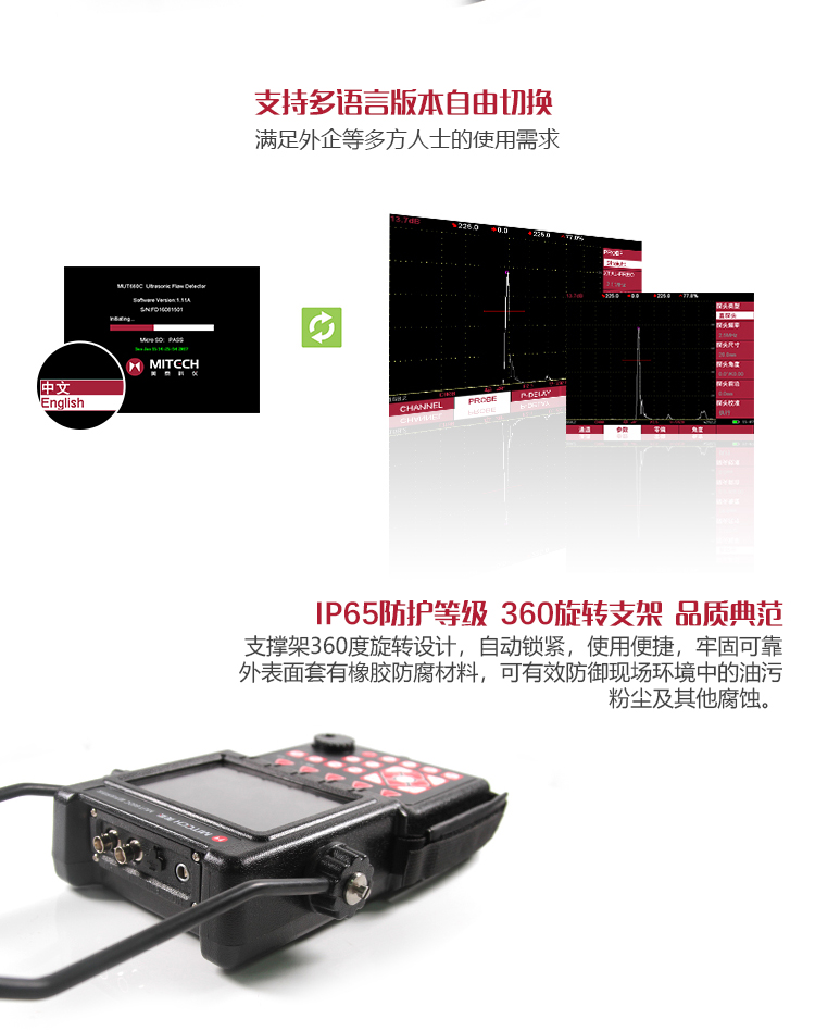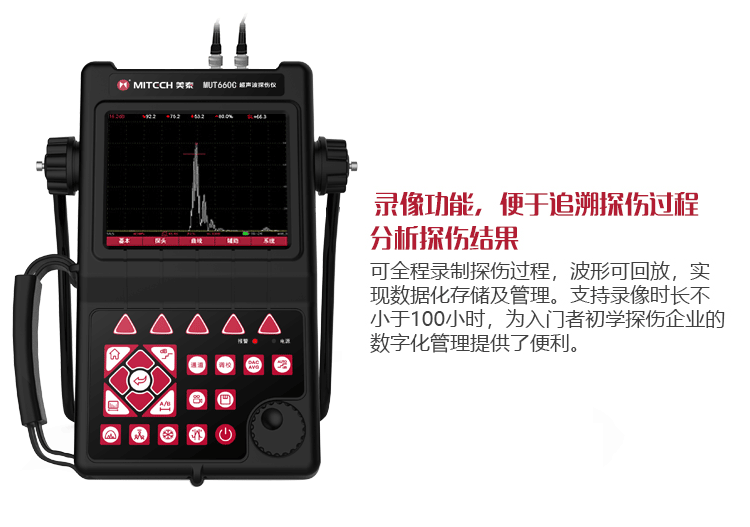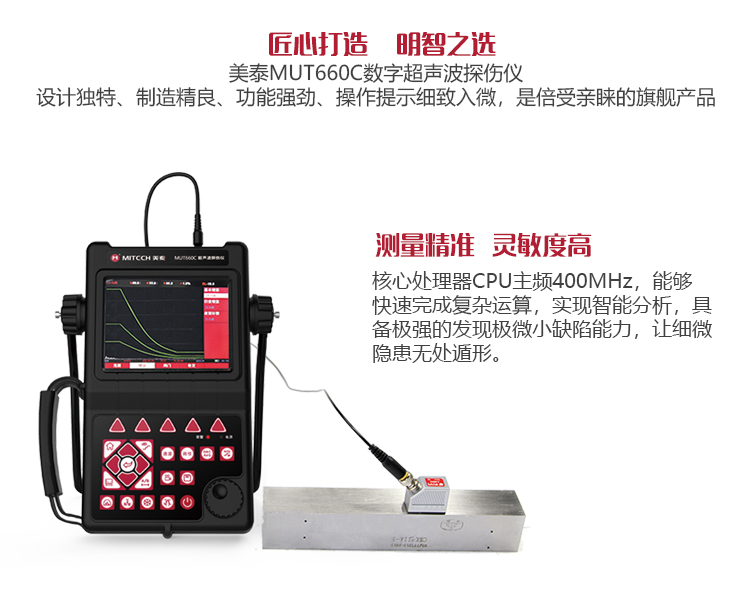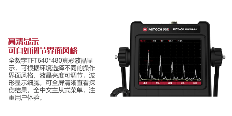 產(chǎn)品概述MUT660C智能數(shù)字式超聲波探傷儀是美泰公司專注多年精心研制的旗艦產(chǎn)品,其設(shè)計(jì)獨(dú)特、制造精良、操作便捷、功能強(qiáng)勁,集諸多優(yōu)勢(shì)于一身,自問世以來一直倍受用戶親睞,它能夠快速便捷、無損傷、精確地進(jìn)行工件內(nèi)部多種缺陷(裂紋、夾雜、氣孔等)的檢測(cè)、定位、評(píng)估和診斷。采用全數(shù)字TFT 640×480真彩色液晶顯示屏,可根據(jù)環(huán)境選擇操作界面風(fēng)格,液晶亮度可調(diào)節(jié),界面設(shè)計(jì)人性化、波形顯示細(xì)膩;可全屏清晰發(fā)現(xiàn)缺陷;單手可把持操作,曲線制作、探頭校準(zhǔn)等常規(guī)操作均可自動(dòng)完成;核心處理器CPU主頻400M,能快速完成復(fù)雜運(yùn)算,實(shí)現(xiàn)智能缺陷分析;低功耗設(shè)計(jì)配備大容量高性能鋰離子電池模塊可連續(xù)工作10小時(shí)以上;全中文主從式菜單,注重用戶體驗(yàn),集快捷按鍵、數(shù)碼飛梭旋輪、十字菜單三種操作方式于一體,不同使用習(xí)慣均可操作自如;支持多語(yǔ)言。防水、防油、防塵可達(dá)到IP65防護(hù)等級(jí)。是石油、化工、冶金、造船、航空、鐵路等領(lǐng)域缺陷檢測(cè)、質(zhì)量控制、在役安全監(jiān)測(cè)與壽命評(píng)估必備的專業(yè)精密儀器。