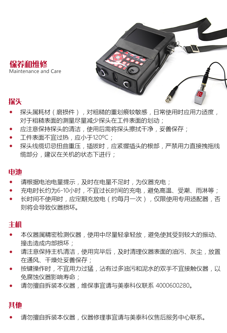 | 美泰標(biāo)準(zhǔn)超聲波探傷儀C系列內(nèi)置電池,電池類型為:鋰電池,電壓:7.2V,電池容量:8800mAh。屬美泰超聲波探傷儀C系列產(chǎn)品的標(biāo)準(zhǔn)配置。使用中,切勿自行拆解電池組;僅限使用本公司提供的專用的電源適配器進(jìn)行充電,否則將會(huì)導(dǎo)致電池?fù)p壞,長(zhǎng)時(shí)間不使用時(shí),應(yīng)定期充放電(約每月一次),防止失效。 | |