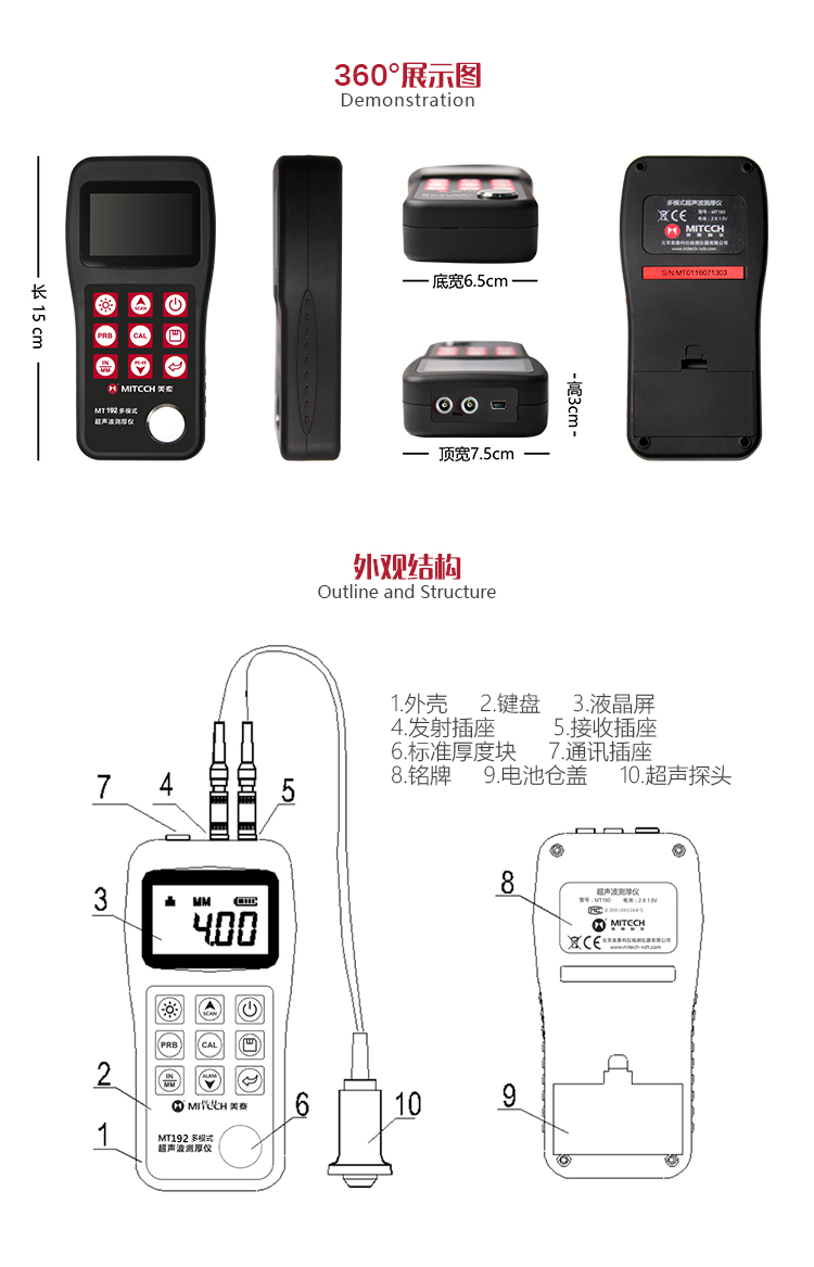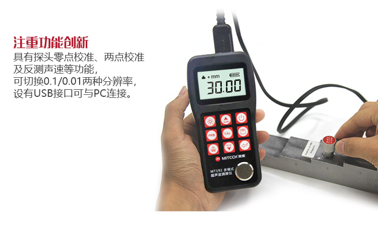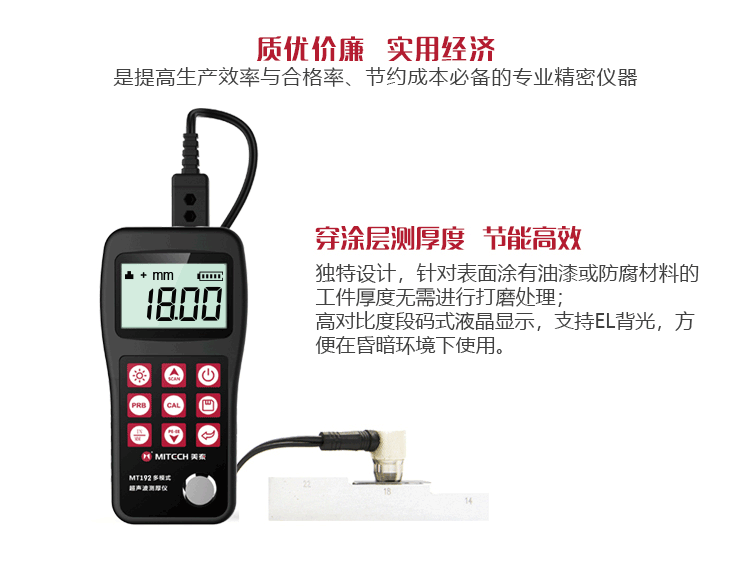 產品概述美泰MT192超聲波測厚儀,基于超聲波測量原理,可對金屬、塑料、陶瓷、玻璃及其他多種超聲波的良導體材料進行厚度測量,也可實現對材料聲速的反測。與傳統的測量方法相比,超聲波測厚儀的優勢在于它只要接觸到被測工件的一面即可完成測量,其獨特的可穿透涂層測厚度的性能為表面涂有油漆或防腐材料的工件厚度檢測提供了更加高效的解決方案,測量前無需處理掉表面的涂層,可以直接測量。被廣泛應用于石油、化工、冶金、造船、航空、航天等領域的生產設備中各種管道及壓力容器腐蝕減薄程度的監測,也可用于對各種板材及各種加工零件做精確的測量。是提高生產效率與合格率、節約成本必備的專業精密儀器。