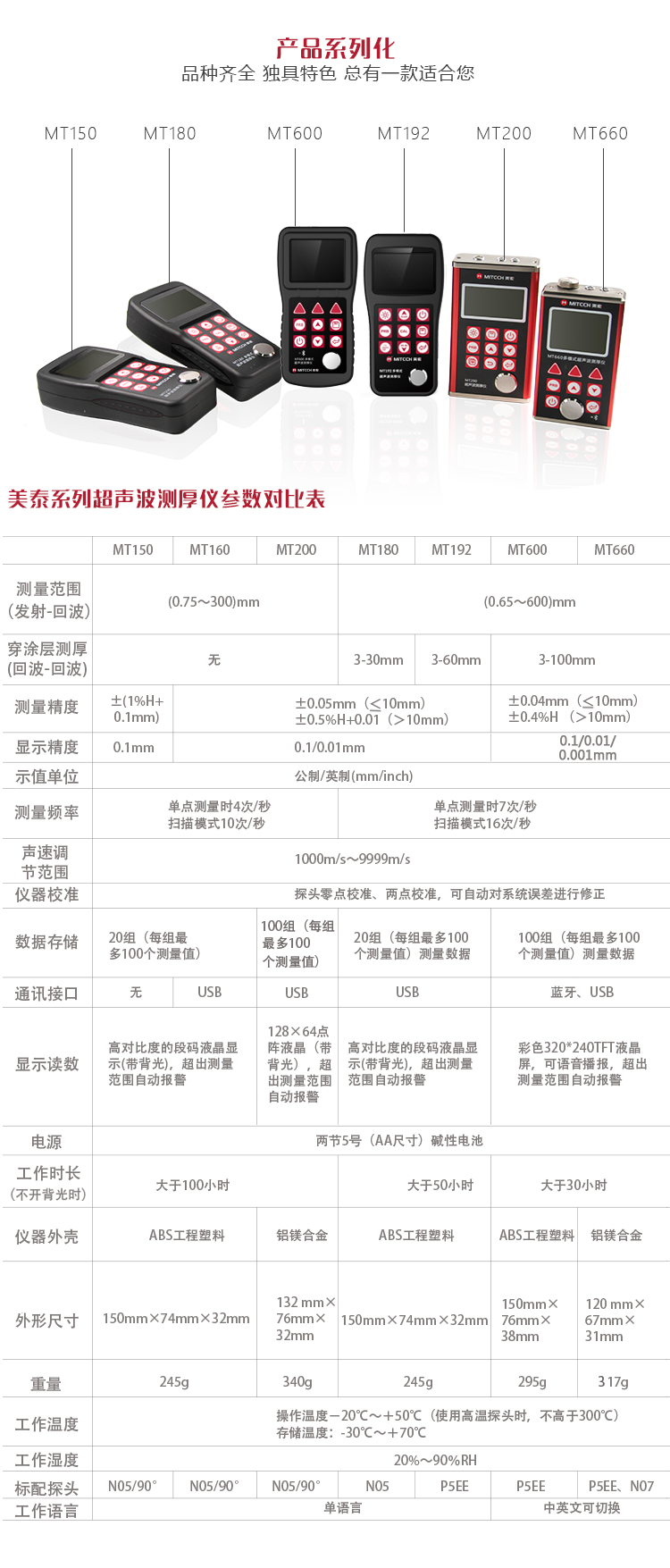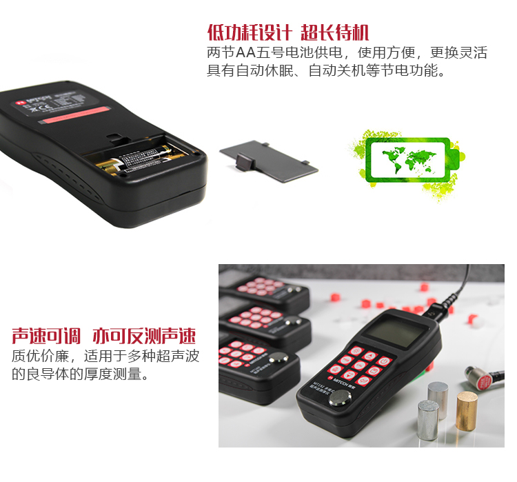 | 美泰系列超聲波測厚儀,均采用低功耗設計理念,超長待機,MT150/MT160/MT200/MT180/MT192/MT280/MT600/MT660均由兩節AA五號電池供電、更換方便。 | |