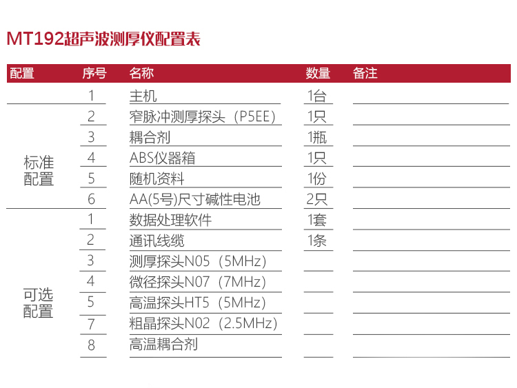 | 探頭直徑 | 測厚探頭NO5直徑10MM、微晶探頭N07直徑6MM、高溫探頭HT5直徑12MM、窄脈沖測厚探頭P5EE直徑10MM、粗晶探頭直徑12MM |