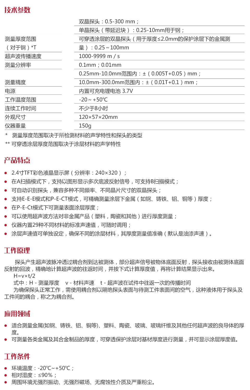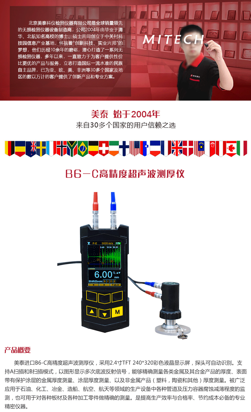 美泰進(jìn)口B6-C高精度超聲波測厚儀,采用2.4寸TFT 240*320彩色液晶顯示屏,探頭可自動識別。支持A掃描和B掃描模式,以圖形顯示多次底波反射信號,能夠精確測量各類金屬及其合金產(chǎn)品的厚度、表面帶有保護(hù)涂層的金屬厚度測量、涂層厚度測量、以及非金屬產(chǎn)品(塑料,陶瓷和其他)厚度測量。被廣泛應(yīng)用于石油、化工、冶金、造船、航空、航天等領(lǐng)域的生產(chǎn)設(shè)備中各種管道及壓力容器腐蝕減薄程度的監(jiān)測,也可用于對各種板材及各種加工零件做精確的測量。是提高生產(chǎn)效率與合格率、節(jié)約成本必備的專業(yè)精密儀器。